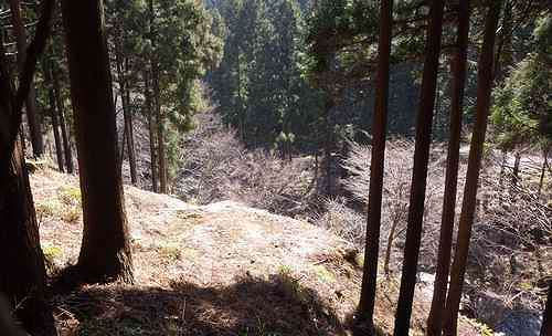 写真左の枯葉の砂地から上部は立木があるあたりを
