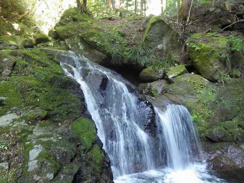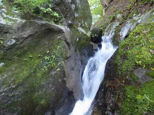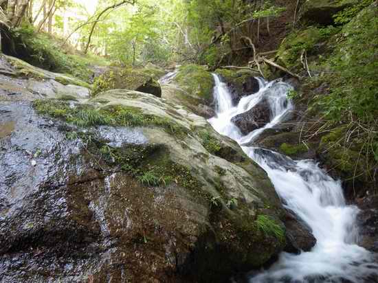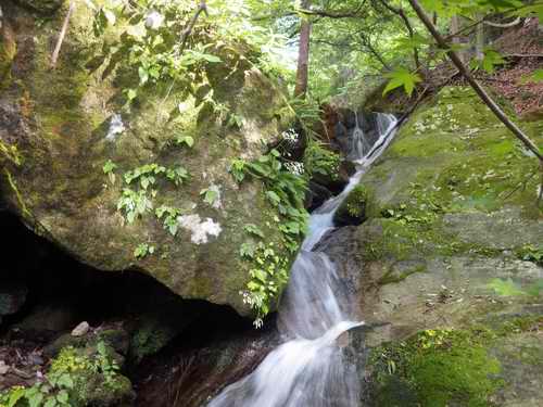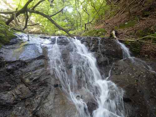 その気になって進むと、登山道脇の杉木立や大岩に目隠しされるような位置にちいさな小滝やナメが幾つかあり、楽しめる。
