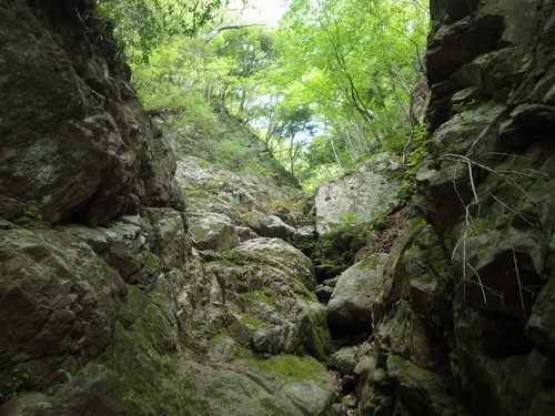 続いているナメは岩の上にコケがこびり付いて滑る感じがしたので左岸3mの露岩上縁を四つんばいになって20m進んでから沢に降りて登山道に戻る。