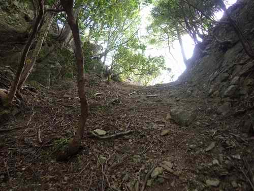 左右共に急傾斜な脆い岩に囲まれていて、登りだしたら