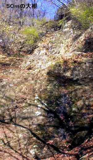一枚岩のせまい沢床を進むと50mの大滝に出る。