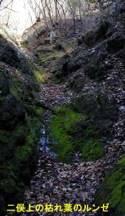 そのせまいルンゼ状は腰までもぐり込む枯れ葉で埋まっていて、その中に幾つか小さな滝がある。