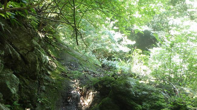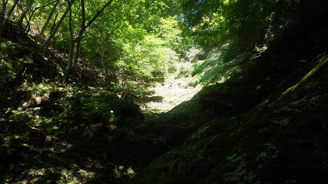 こんなように簡単に沢に戻れるとは思いもしなかったが、数十mほど下ると真下に落ち口があって、そのまま滑ると滝下にまで落ちそうななので、やや上流側に場を移動して沢に戻る。