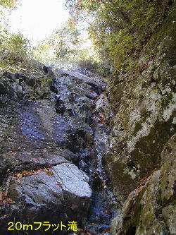 滝と滝の間に傾斜のない部分が僅かに有るのに安心して、思いっきり短い足を開脚し、股の間から下方の光りに輝く紅葉と、さっき登ってきたナメ滝の流れを臨む。