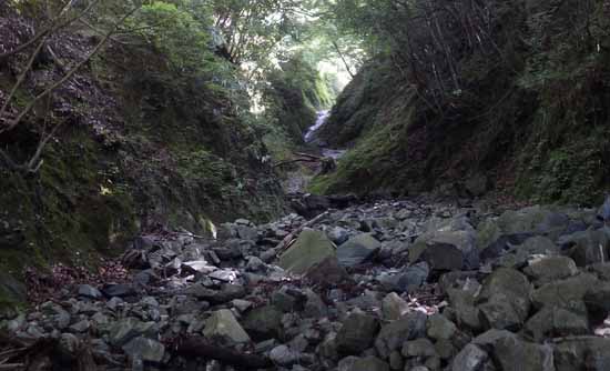 ゴロゴロと石の堆積した沢の奥には岩床がカーブを描いて奥に上がっていく。