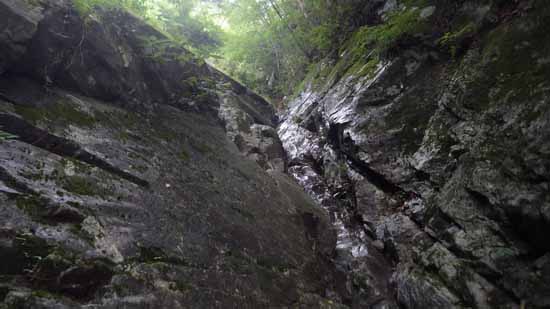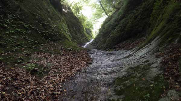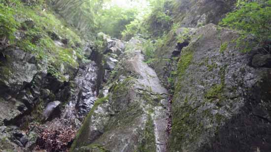 左は石が集まってゴロゴロした涸沢で、右側は岩床となっているが、お世辞にも綺麗だとまでは書けない狭い沢。