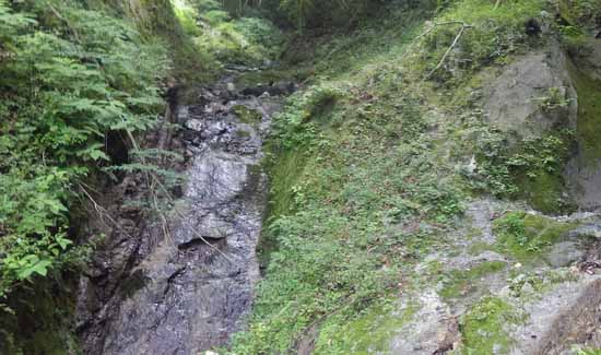 見える範囲で言えば、山腹に食い込んでいく岩床の上端は苔付きの狭い陰険な岩場となっていて、ほとんど行かずに岩床形状が消えてしまうだろう。