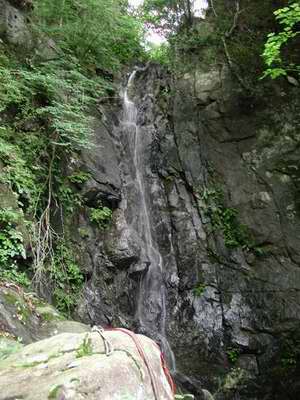 滝壺から10m程はなれた下の滝の落口上の石に捨て縄がぐるっと巻かれ、上と下の滝の確保点となっている。