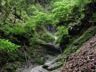 気温が高まってきた季節に、青々しい若葉のトンネルを左右に払いながらも、藪の無い堅い岩の上を薄く流れる水の上を歩くのは気分がよい。
