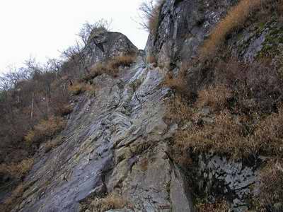 厳密には登ったことが無いから分からないが、見た目には純層の乾いた岩が下部から落ち口まで続いている。