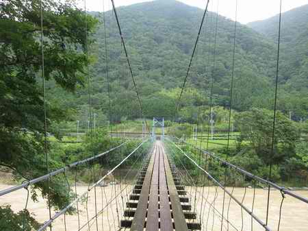 キャンプ場入り口でバスを降り、吊り橋を渡り、いくつか実の残る梅の林を通り抜ける。