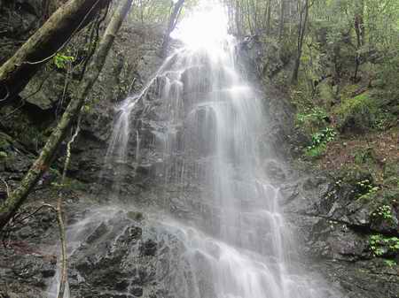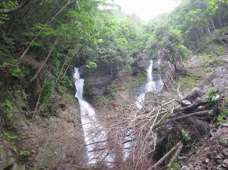 二俣というほどには左は沢状が明確ではないが、簾状の15m程の滝がかかり、右には本流の10m滝はまだまだの水量を持って落ち込む。