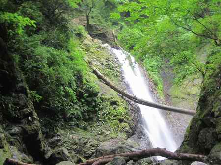 10m程の滝が直ぐ横にあり、その上にも滝が重なり、その奥に何やら大きいのが見える。