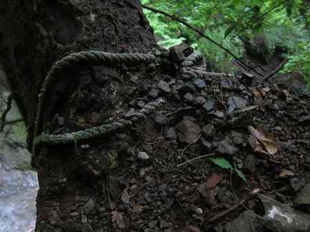 それに、ついさっき倒れたばっかりのような青々とした葉っぱの杉の木数本が石積みの前に横たわっている。
