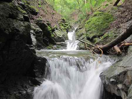 そして沢が幾らか狭くなり、簡単な小滝が二つほど越したところで左右から二つの滝が合流する地点に達する。