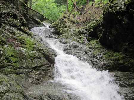 右に折れ曲がった本流の左斜面の高いところから吹き出している二本の湧水が滝状に落ちる。