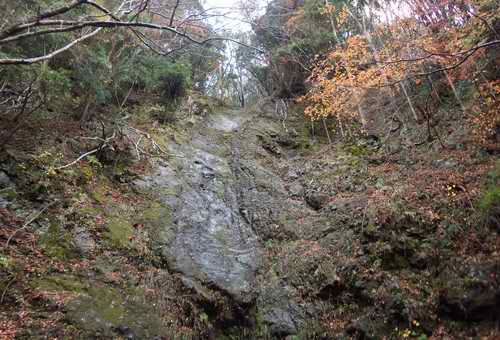 沢床から上の登山道を渡る橋は見えないのは、途中に傾斜緩慢な岩場を含んでいるのであろう。