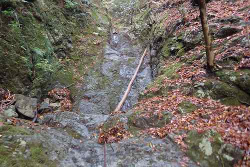 F3滝壺部からは見えてないが、この涸棚は上の登山道の木製橋につながるのだ。