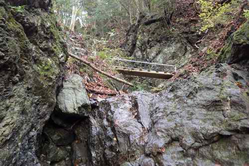 吊り橋から不老山に至る登山道を歩いて暫く行くった途中に岩場状の上縁を短い木製橋で渡る。