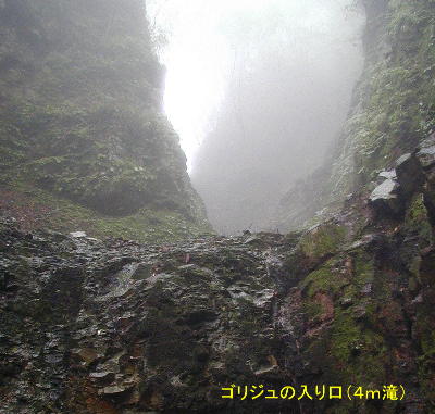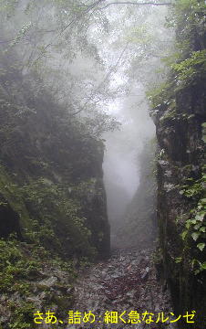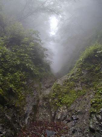 丹沢の沢歩き 石棚沢 U (板小屋沢の頭)の 霧中の悪場(丹沢中川東沢)にためらう マシラ