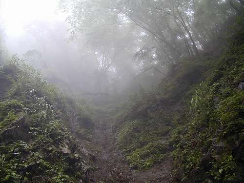 途中で巻いて尾根に上がったら、今日の霧雨ではずぶぬれだろう。
