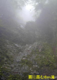 沢は相変わらず急傾斜だが、上部がやや開けCS(チョックストーン)が挟まって、その上にこの沢最大の8m滝となる。