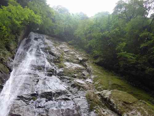 水流に入って傾斜は45〜60°小さな突起でぼこぼこな滝は水を全身に受けても易しく登れる。