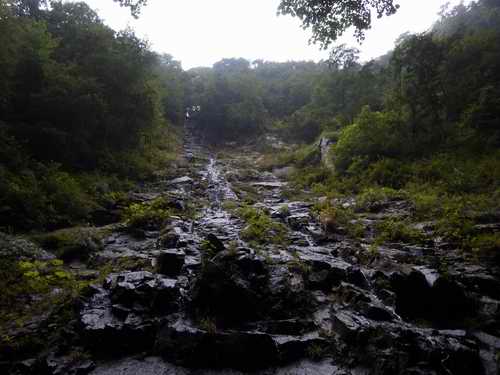 幅広で小さな突起の付いた岩床は傾斜が付いてそのまま次の滝となる。