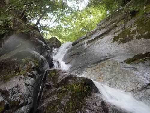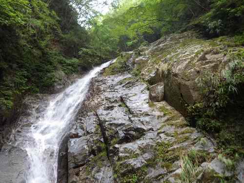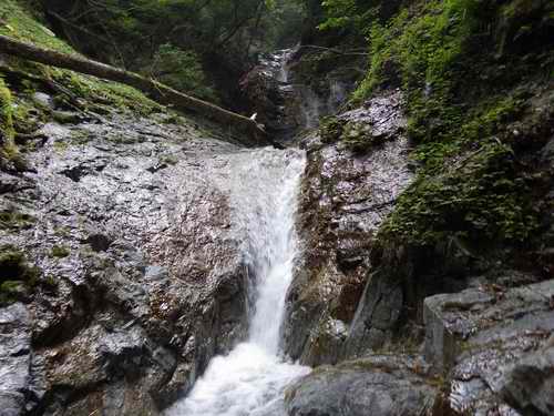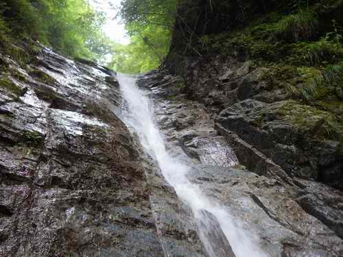 右俣側に入ると30mほどで右俣最初の滝(8m)が左の上から岩床に落ちてくる。