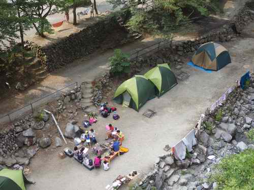 大勢が繰り出していて中高生で往路のバスは満杯だった。キャンプ場では朝飯の片付け時だが、水遊びはまだ始まっていないが子供の声がかわいく響く。