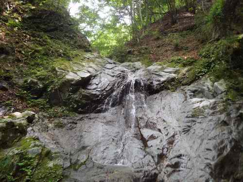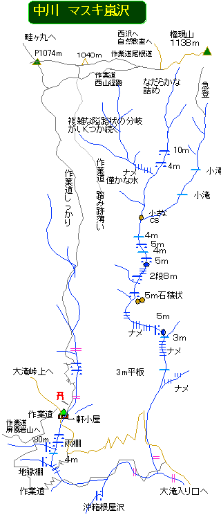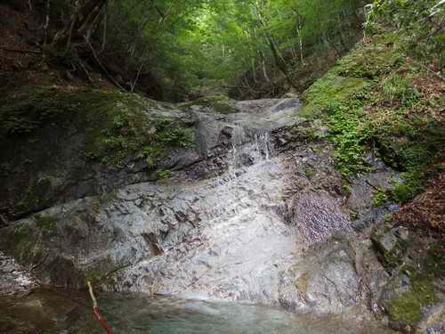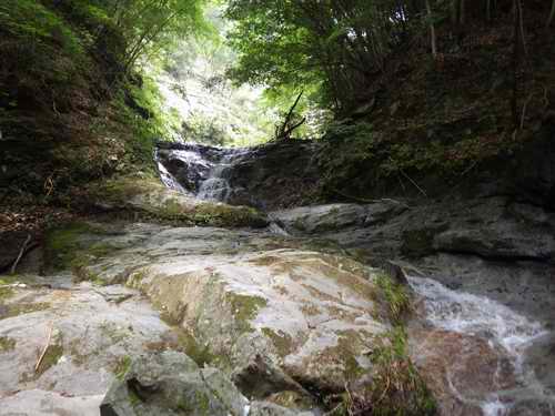 その人等と分かれて滝を一つ越えると水量が減ってきて、更に数個の小滝を追えると沢は二俣、本流は左、真っ直ぐ方向は権現山へ直接登る。