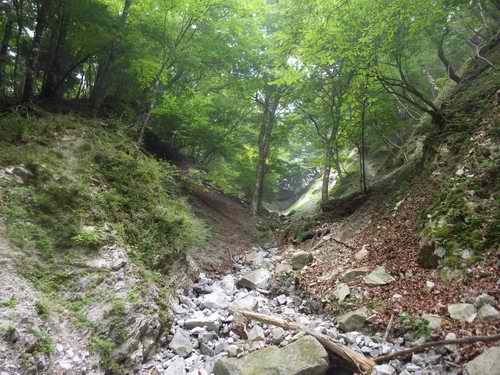 そして雨棚を見て、地獄棚を右の立木帯から巻いて二俣まで行って、そこで地獄棚沢を切り上げた。