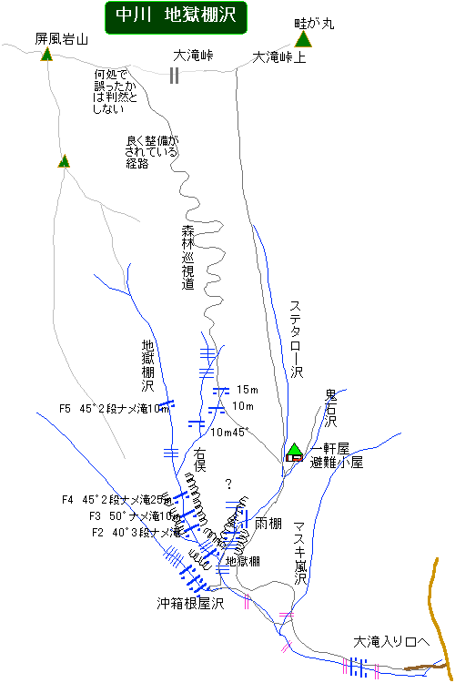 自宅5:50〜新松田6:40-6:54-JR谷峨7:40-富士急バス-中川温泉〜大滝口8:31〜マスキ嵐沢(おそらく8:50頃)〜本流〜沖箱根沢F1見学〜雨棚見学(おそらく9:30ぐらい)〜地獄棚沢(F1は捲く)〜小尾根11:12〜小ピーク11:20〜屏風岩山11:30〜山林管理路〜地獄棚沢右股F1〜一軒小屋跡避難小屋12:20〜大滝峠口13:15〜中川温泉入り口〜13:50富士急バス〜新松田14:50〜本厚木(自宅)2001/08/16 晴時々曇り