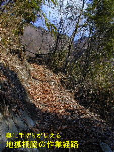 その道は急峻な尾根に丁寧に岩を穿って造り、短く鋭い葛籠折りが続く径路であるが、地獄棚沢側に出るところには落下防止に造作した手摺りが造られている。