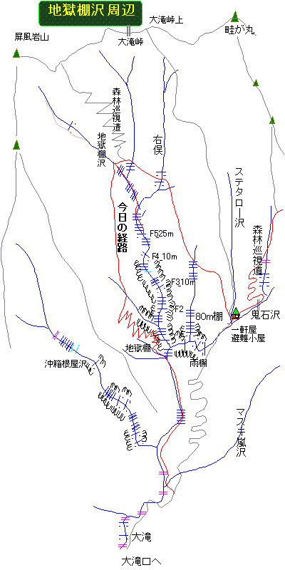 2002/02/23 自宅5:30〜小田急〜新松田6:25〜大滝口7:25〜沖箱根沢F1_7:50〜雨棚8:20〜地獄棚〜手前の窪より右岸の作業径路(巻き道)8:35〜地獄棚沢下部滝場の上〜地獄棚沢右俣F19:15〜巻き道に戻る〜一軒小屋9:40〜鬼石沢本流沿い作業径路〜権現乗越10:20〜下棚10:45〜本棚11:05〜西丹沢自然教室11:25〜12:10箒杉12:45〜大滝口バス停〜12:57富士急バス〜14:10新松田〜本厚木 高曇り(時々日が射す)
