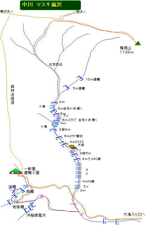 自宅5:20〜新松田6:25〜バス〜大滝キャンプ場7:20〜7:55一軒小屋避難小屋8:05〜地獄棚8:15〜マスキ嵐沢9:00〜巡視路10:27〜権現山10:42〜西沢〜11:15下棚11:25〜11:35本棚11:45〜12:10西沢出会(西丹沢)12:50バス〜13:40新松田〜自宅 2000/08/12