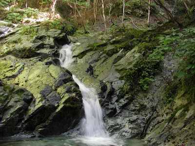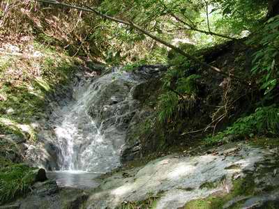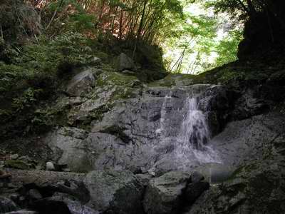 僅かな傾斜のナメ(L=10m h=3m程)を越え、流れは左に大きく曲がり、深さ70cm程の小釜を従えて5m程の滝に続く。