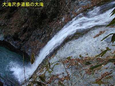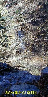 それでも、「雨棚」の左上の大岩の木々が見え、その右下脇から勢い良く流れ落ちる様がこの滝の落ち口より相当下方、約30m下に見て取ることが出来た。