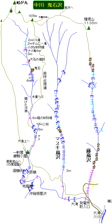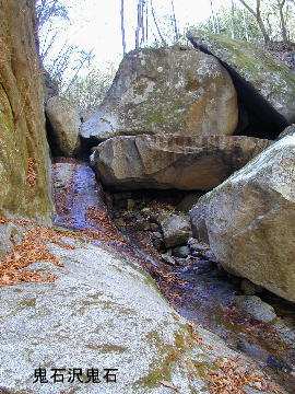 自宅6:10〜本厚木〜松田7:10〜大滝入り口8:00〜大滝(途中にかかる白スラブの滝)〜マスキ嵐沢出会い〜地獄棚出会い〜一軒小屋9:00〜鬼石沢〜畦が丸10:47〜権現山への踏み跡〜1079mp〜権現山への分岐〜鬼石沢沿いの仕事道〜一軒小屋11:53道の分岐に間違わなければ畦が丸から30〜40分ほどの時間だろう)〜屏風岩山への仕事道〜80滝からの「雨棚」を見る〜一軒小屋12:22〜大滝入り口12:45〜悪沢F2の見学 ここを3回ほど登り、簡単な登りだったという記憶が有るが今はとても登れる自信は無い。そこから中川畑地区に引かれている簡易水道管敷設道を中川まで歩く。丁寧に掘削された道の痕跡に大変な労力を感ずるが今はもう、使わない道だ。〜バス時間まで間があるので〜細川橋まで歩く。先輩の細川さんの実家があるところで彼の実家の屋号が橋の名前になったとか。13:50〜富士急バス〜新松田14:50〜本厚木 2001/12/16 晴れ