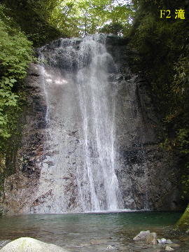 そこから直上するとF2の捲き道が下棚落ち口から上がってきていて、それを下方向に行き、手がかりの少ない凹状に入り、ラストは飛び降りて沢床に立つ。