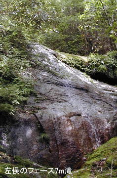左のフレークを使い滝の横2mを登ってヤブに突っ込み、大岩を回り込んで滝に戻る。