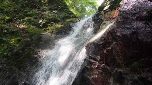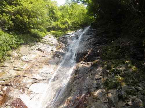 岩の表に薄赤〜茶色の水垢が付いてはいるが、その下の石英閃緑岩の白地が透けているような広いスラブの上を水が涼しやかに撫でて流れ落ちる。