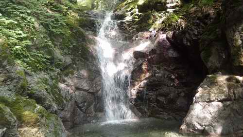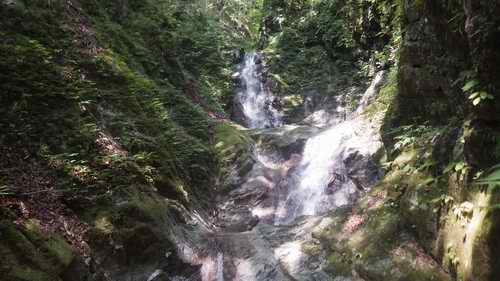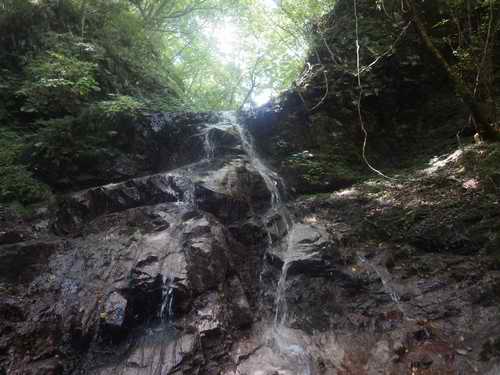 一軒小屋にもう少しの位置にある滝付近で下から声が聞こえたので登山道から見下ろすと女子二人が滝登りを始め用としてい。