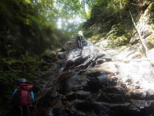 でもフリクションを気にするのは三段滝に入ってからのことであり、ここの一番の課題はそのナメ部分に入るための出だしの5m部分をどう処理するかだ。