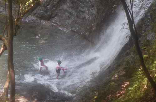 大勢が大滝下の滝壺を埋め、キャニオリングもどきに岩床を滑り、そこから溢れ出た子供らは堰堤上で遊ぶ。