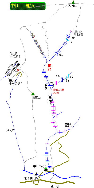 「棚沢」は中川温泉、湯ノ沢の温泉など家並が入口となる沢だ。
