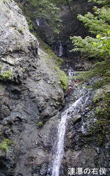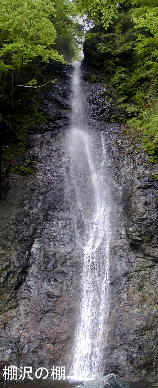 両岸からの樹葉でつながって見える狭い落ち口から直瀑が10m程落下し、一旦、岩肌に僅かに触れて、残りは一気に落下する。
