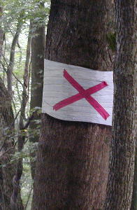 その標識の周りには、ごく最近に大勢の人がたたずんだのだろうか、シャッターを切る位置と合わせて記念写真をしたのか、踏み跡が杉の腐葉土の中に無数にある。