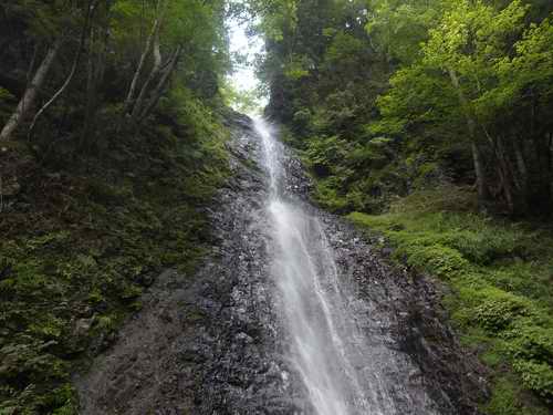 細かく見れば、中央に水が岩に当たるところがあり、全くの一枚ではないが、そこはバンド状と言うほどには確かなものではなく、広い沢の左右から立ち上がってくる大露岩を中央に集めて出来た一枚岩の大棚だ。
