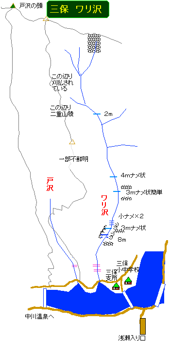 漢字で書くと「悪沢」と書かれるので中川奥の悪沢と区分けするためにワリ沢と呼ばれているらしいが、昭和42年発行の「現代登山全集」に「悪い棚が一つある」と短く紹介されている。